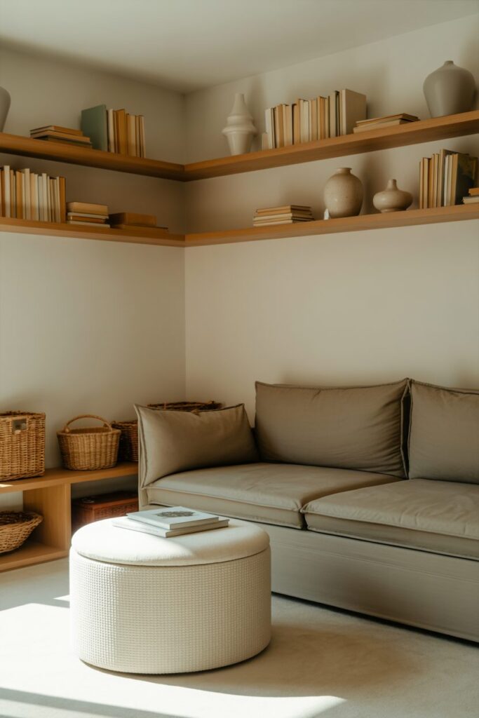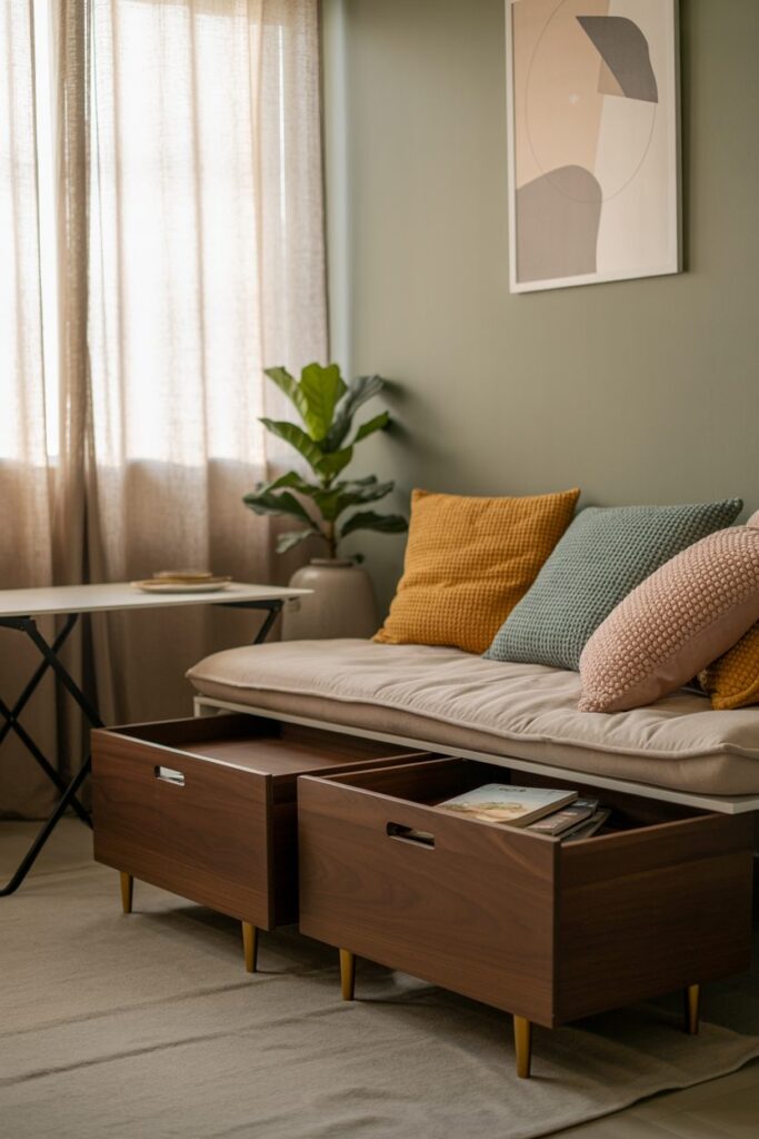 Sofas with hidden drawers or open space underneath can be used to store blankets, pillows, or seasonal items. Wall-mounted cabinets are another helpful solution because they keep belongings accessible while freeing up valuable floor space. Storage ottomans remain one of the most practical additions, offering both seating and concealed storage.