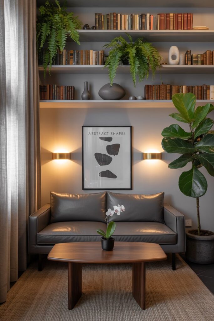 Wall-mounted shelves are a simple and practical solution for displaying books, decorative objects, or small plants. Tall and narrow furniture pieces, such as slim bookshelves or vertical cabinets, also provide storage while taking up very little floor area. Hanging plants are another creative option that adds greenery without using valuable ground space.