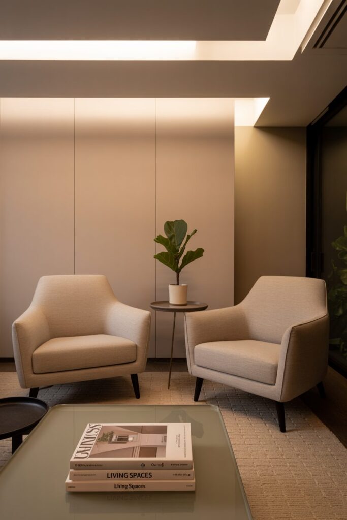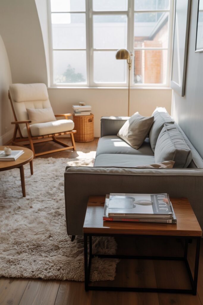 Low-profile sofas and chairs work well because they take up less visual space and allow the room to feel more open. Glass coffee tables are another clever choice because their transparent surfaces make them appear lighter and less bulky. Chairs with slim legs also reveal more of the floor, helping the room appear larger.