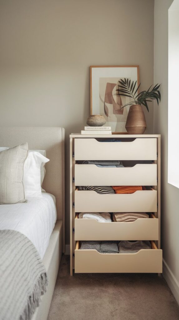 These organizers work especially well for smaller belongings like socks, undergarments, jewelry, and tech accessories. Maintaining control inside drawers supports the overall success of your Smart Small Bedroom Organization Ideas.