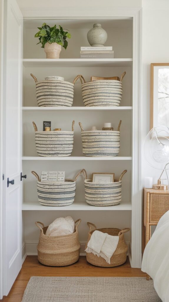 Choosing baskets in matching colors or materials helps maintain a cohesive appearance. Containing clutter in an organized way supports long-term Smart Small Bedroom Organization Ideas.