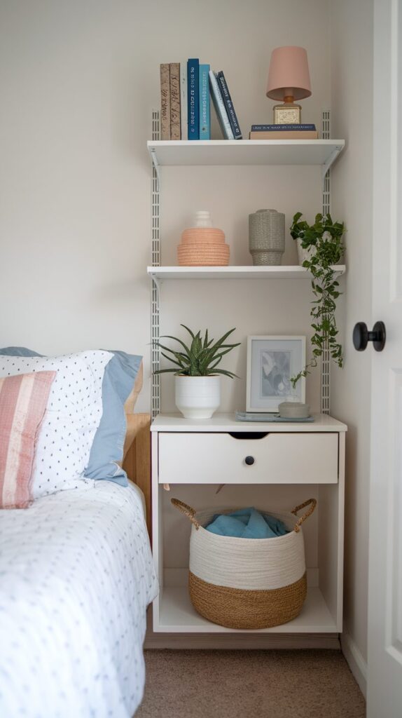 These shelves can hold books, baskets, decorative pieces, or everyday essentials. When each shelf has a clear purpose, the room looks organized rather than cluttered. Making use of vertical space is a core part of Smart Small Bedroom Organization Ideas because it expands storage without expanding the room itself.