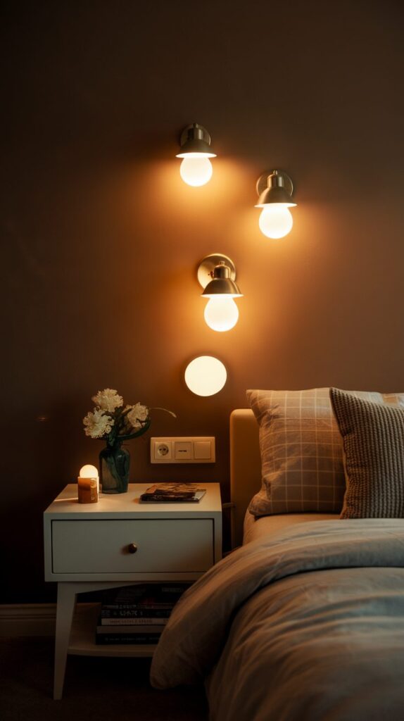Using wall-mounted fixtures, table lamps, or warm-toned bulbs adds depth and softness. The room feels more welcoming and intentional rather than crowded.