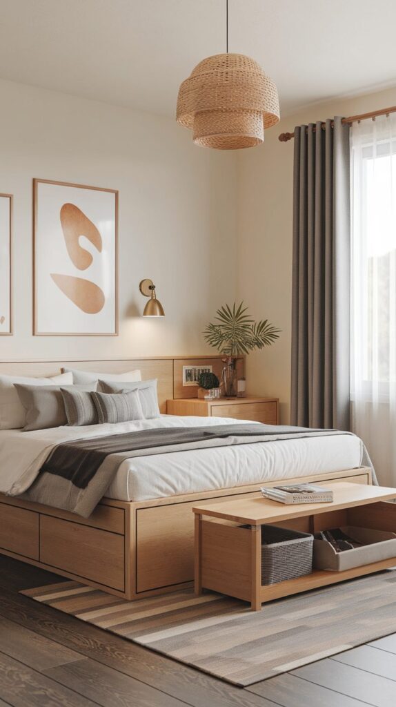 Choosing a neutral design helps it blend seamlessly into the room. This balance of function and subtle style makes storage ottomans a strong addition to Smart Small Bedroom Organization Ideas.