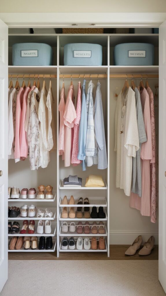 Separating areas for hanging clothes, folded pieces, shoes, and accessories prevents everything from blending into one messy pile. Dividers, small containers, and labeled bins help maintain structure. When each item has a designated spot, keeping the closet tidy becomes much easier.