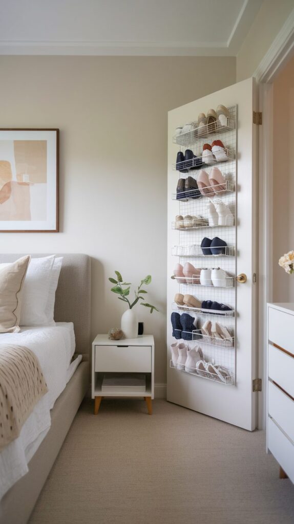 Selecting neutral colors or structured designs helps the organizer blend into the room instead of looking cluttered. Using door space wisely is another example of Smart Small Bedroom Organization Ideas that increase storage without crowding the room.