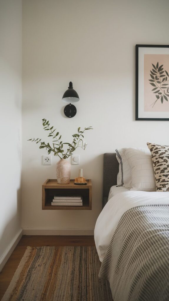Choosing a floating nightstand with a drawer or shelf keeps it functional while maintaining a minimalist look. This approach combines style and storage, making it one of the more modern Smart Small Bedroom Organization Ideas.