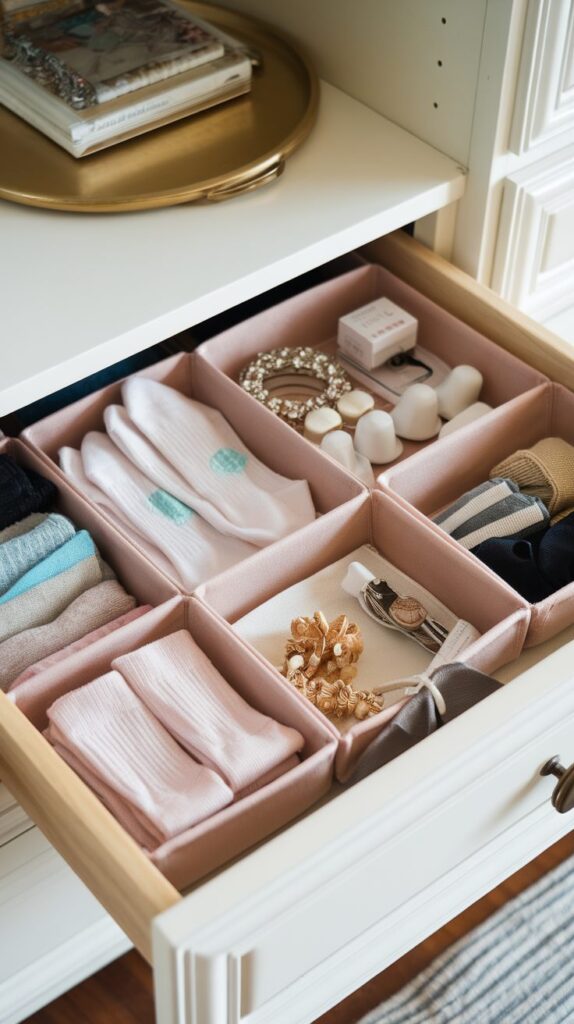 Dividing drawers into smaller compartments gives every item its own place. Instead of shoving things in, you place them neatly. Over time, that small habit keeps the entire room more orderly.
