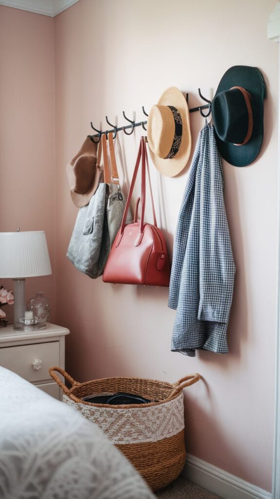 Using matching hooks or a coordinated rail keeps the setup looking intentional. Thoughtful placement of hooks fits perfectly into Smart Small Bedroom Organization Ideas focused on convenience and simplicity.