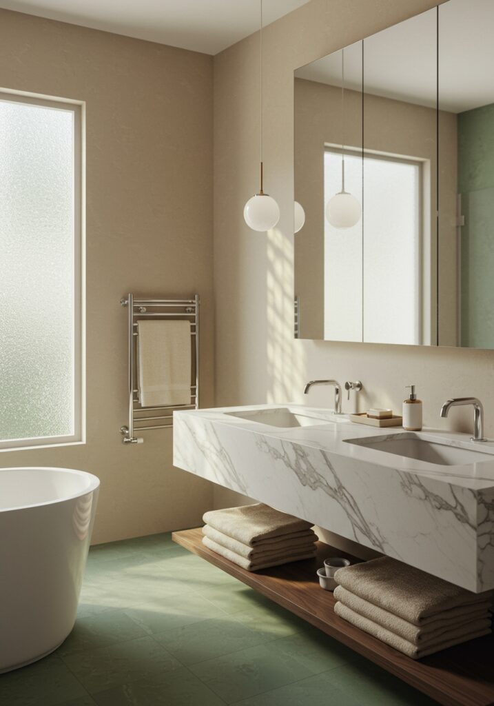 I stick to beige, soft gray, and light greens because they reflect light and feel clean. Research shows lighter shades can make a room feel up to 20% larger, which really helps in smaller bathrooms.