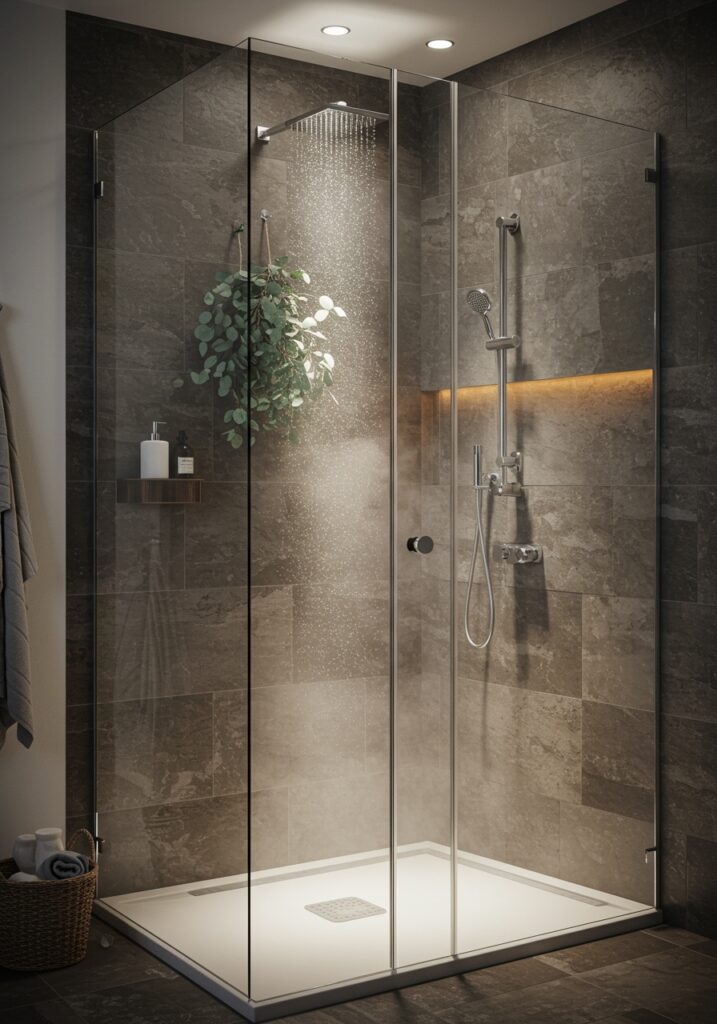 I recommend glass panels and a rainfall showerhead. This setup creates an open feel and mimics real spa environments.