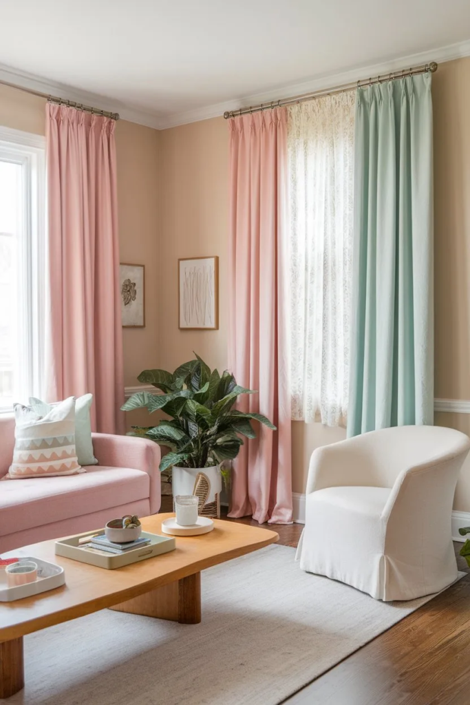 Lightweight pastel curtains allow more natural light into your home. They replace heavy winter drapes with a softer, brighter feel. This change makes rooms feel open and airy.
