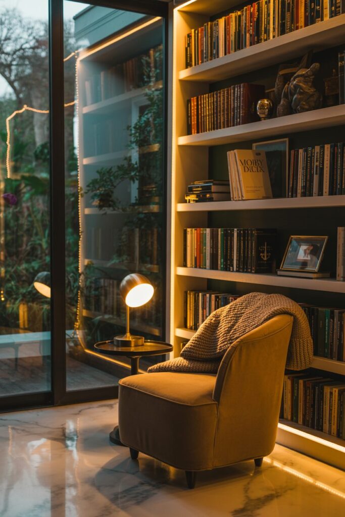 I placed string lights around my bookshelf, and it made the entire corner feel warmer. You can also hang them near your chair or along the wall beside it. If you don’t have a power outlet nearby, battery-powered lights are a great solution.