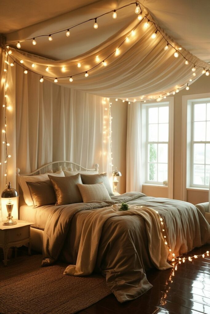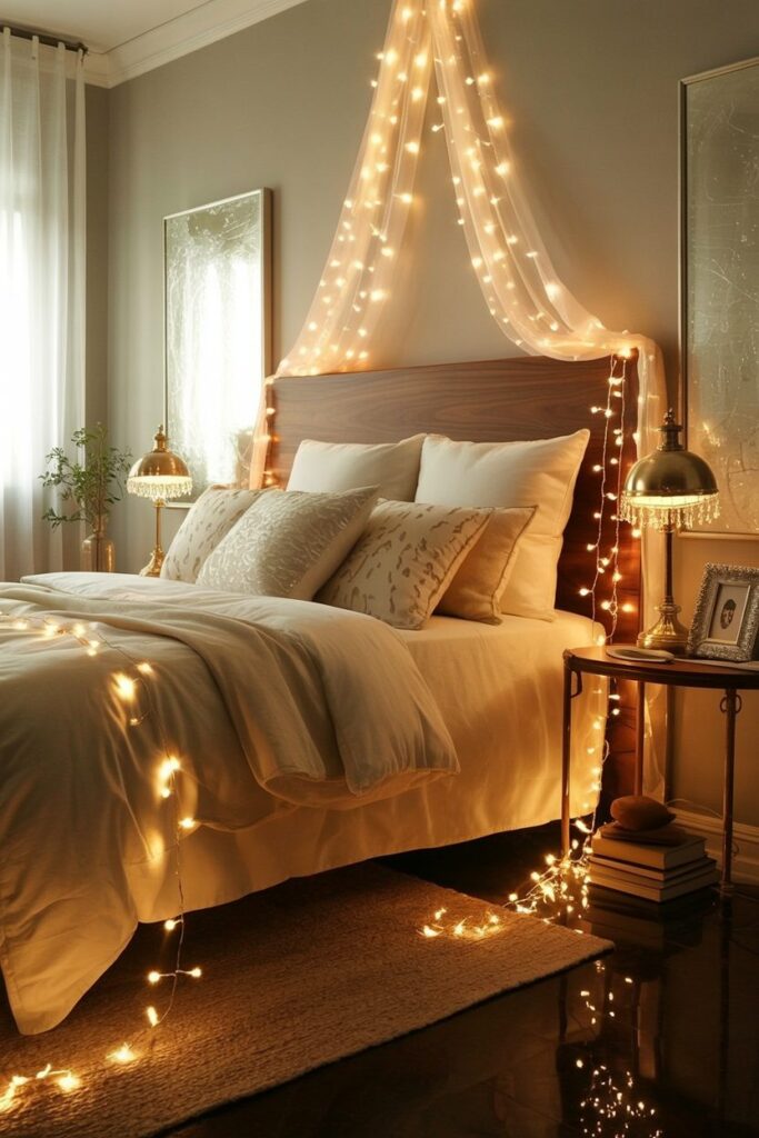 Transforming your bed area with overhead lights can completely change how the room looks and feels. By arranging string lights above your bed, you can create a soft canopy effect that feels warm and comforting. This idea works especially well if you have a frame or structure where lights can be draped, but it can also be done creatively with simple hooks or ceiling attachments.
