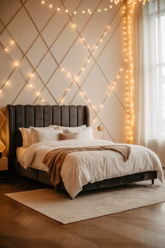 If you prefer something subtle yet stylish, placing lights around your headboard can add just the right amount of brightness. This approach keeps the focus on your bed while giving the room a warm accent. It’s ideal for anyone who wants decorative lighting without changing too much of the existing layout.
