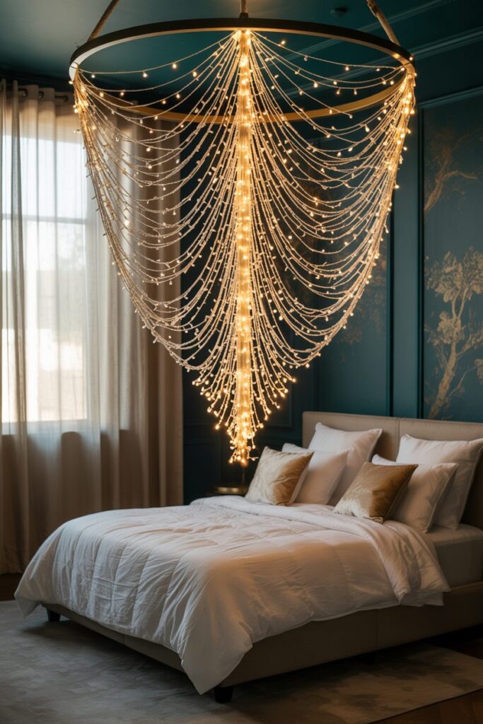 If you enjoy hands-on decorating projects, designing your own light feature can become a standout piece in your bedroom. A handmade string light fixture can fill empty ceiling space while adding warmth from above.