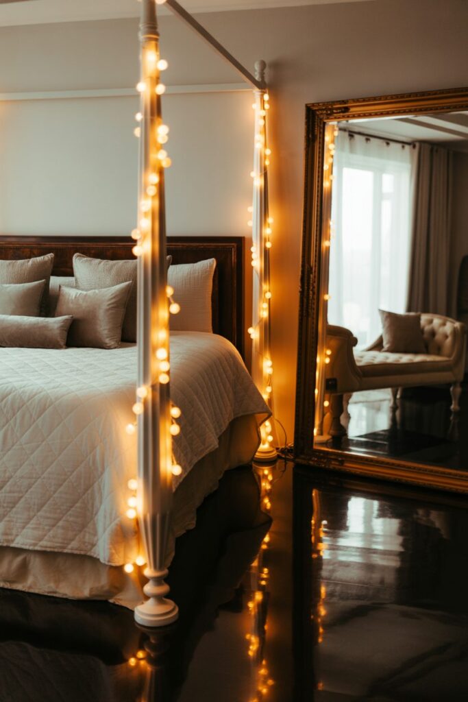 Wrapping lights around bedposts or mirrors introduces a subtle decorative element that feels charming and elegant. This approach works well in both small and spacious bedrooms, adding dimension without clutter.