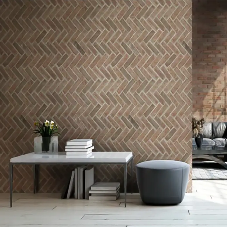 For a more dynamic look, bricks can be arranged in a herringbone pattern. This interlocking design draws the eye and adds movement to a single accent wall. To make it stand out, keep the rest of the room simple with neutral furniture and plain walls. You can also use contrasting mortar colors—like white with red bricks or black with gray bricks—to emphasize the pattern. The repetitive geometric layout adds energy without overwhelming the space.