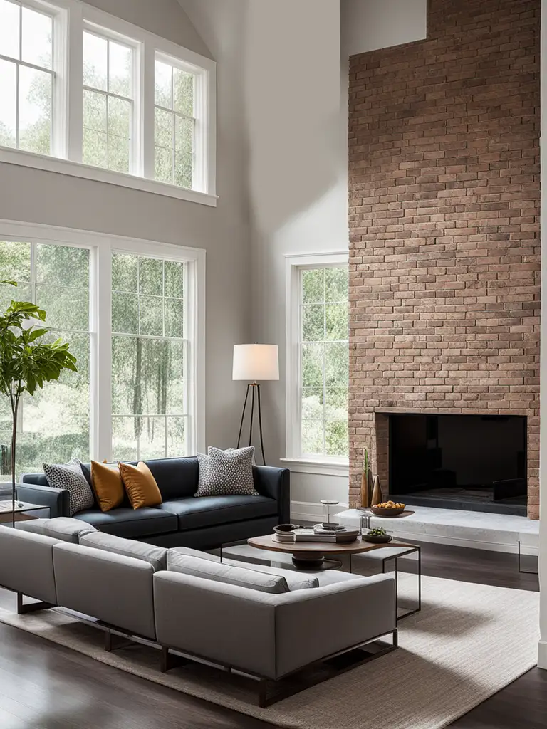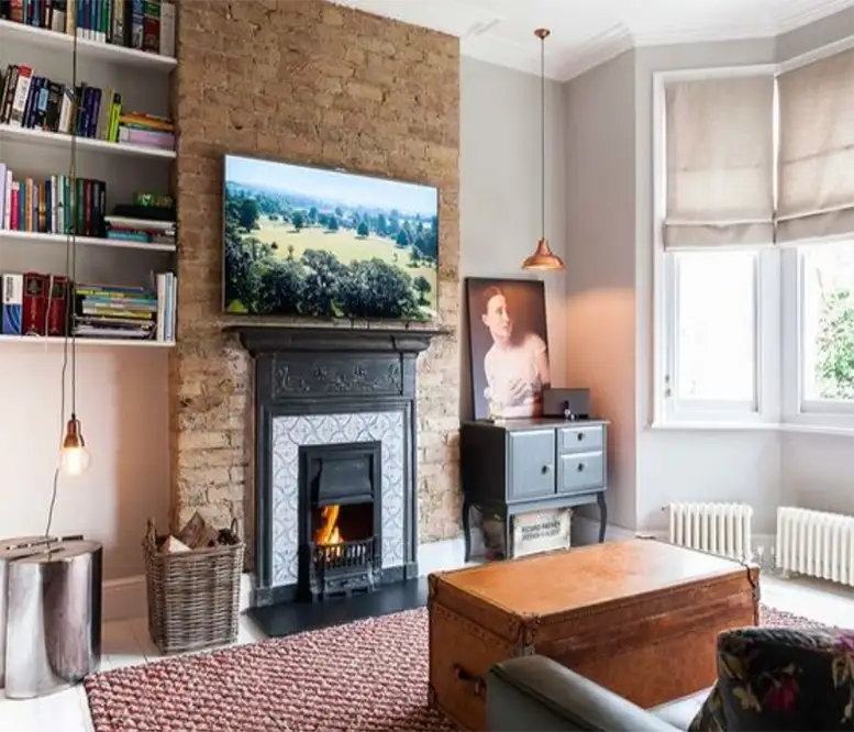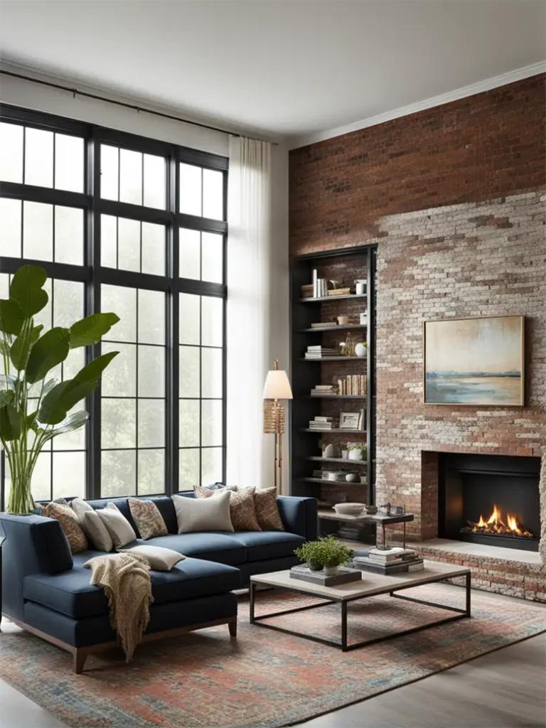 A classic brick fireplace adds warmth and timeless style to a living room. It can be built tall with a chimney or kept lower for a modern feel. Pairing it with built-in shelves, cubbies, or bookcases adds both symmetry and functionality. Wooden shelves or metal accents contrast beautifully with the bricks. Styling the mantel with photos, plants, or books completes the look and makes the fireplace a centerpiece.