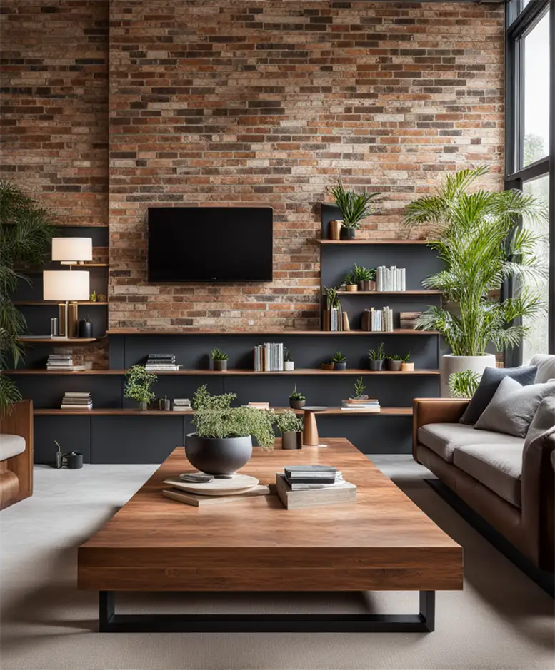 Brick shelves combine function with style. Exposed brick layers can support floating shelves for displaying books, plants, or decorative objects. You can contrast the shelves with wood or paint them to stand out. The brick backdrop enhances the displayed items and adds natural texture to the room.