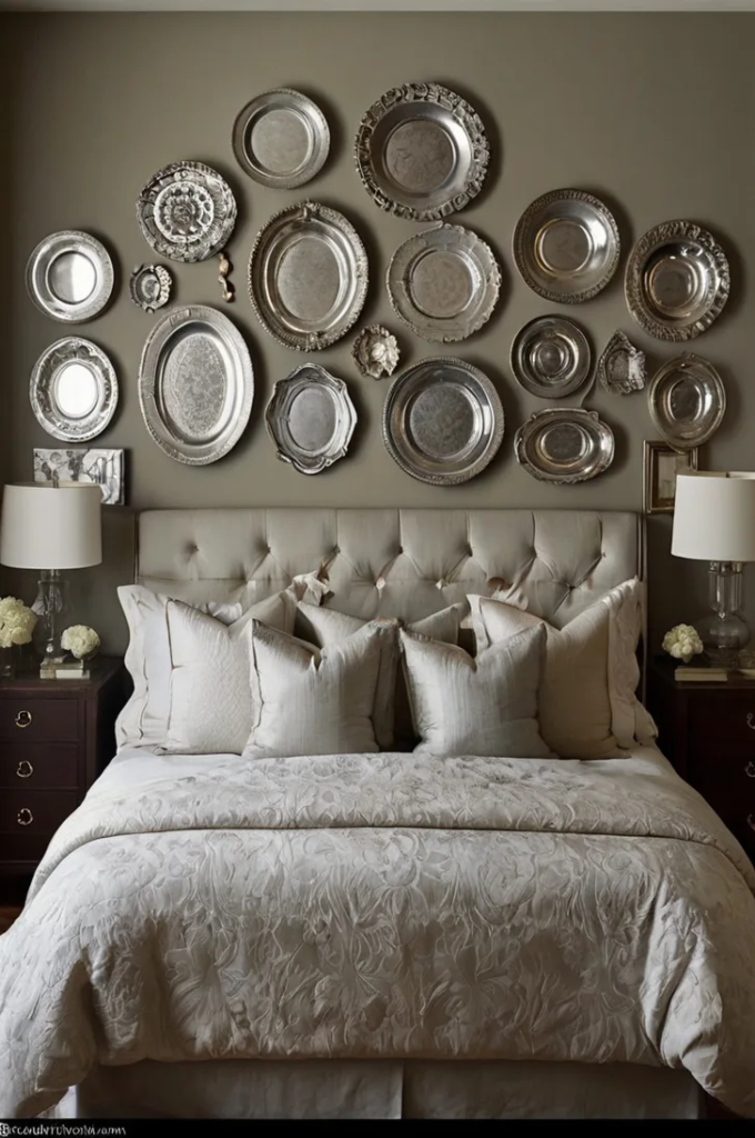 Displaying decorative plates adds a classic and refined feel to the bedroom. Mixing different styles keeps the arrangement visually interesting. Varying sizes and finishes prevents the display from feeling flat and works well against simple wall colors.