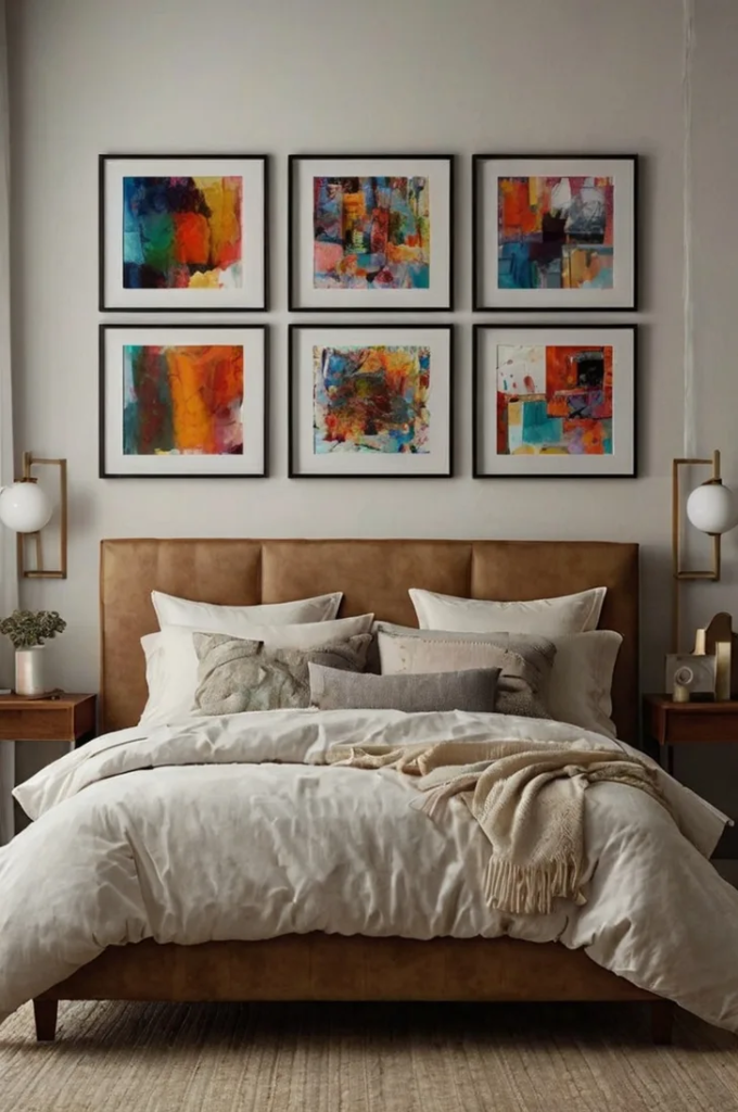 Overlapping artwork creates depth and movement above the bed. A consistent color palette keeps the display visually cohesive. This arrangement allows for mixing different art styles while maintaining balance.