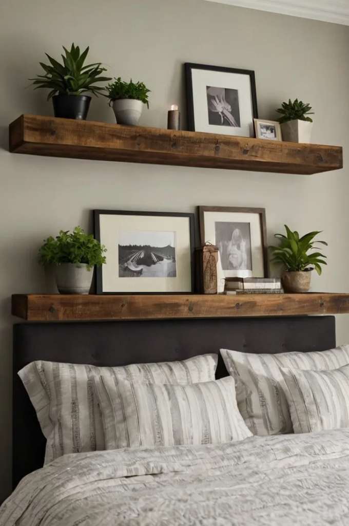 Shelves provide both storage and decoration. They allow personal items to be displayed in an organized way. Keeping the layout balanced helps maintain a clean and intentional appearance.