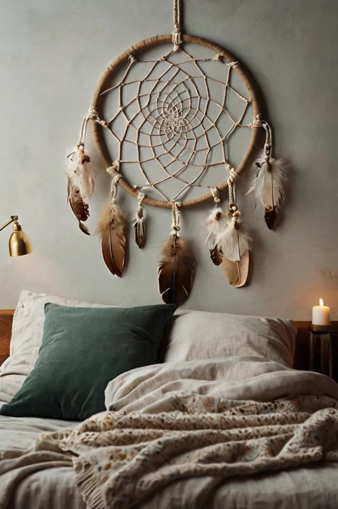 Dreamcatchers bring a symbolic and decorative element to the bedroom. Using multiple sizes adds visual interest. Sticking to a consistent color range helps the display feel harmonious.
