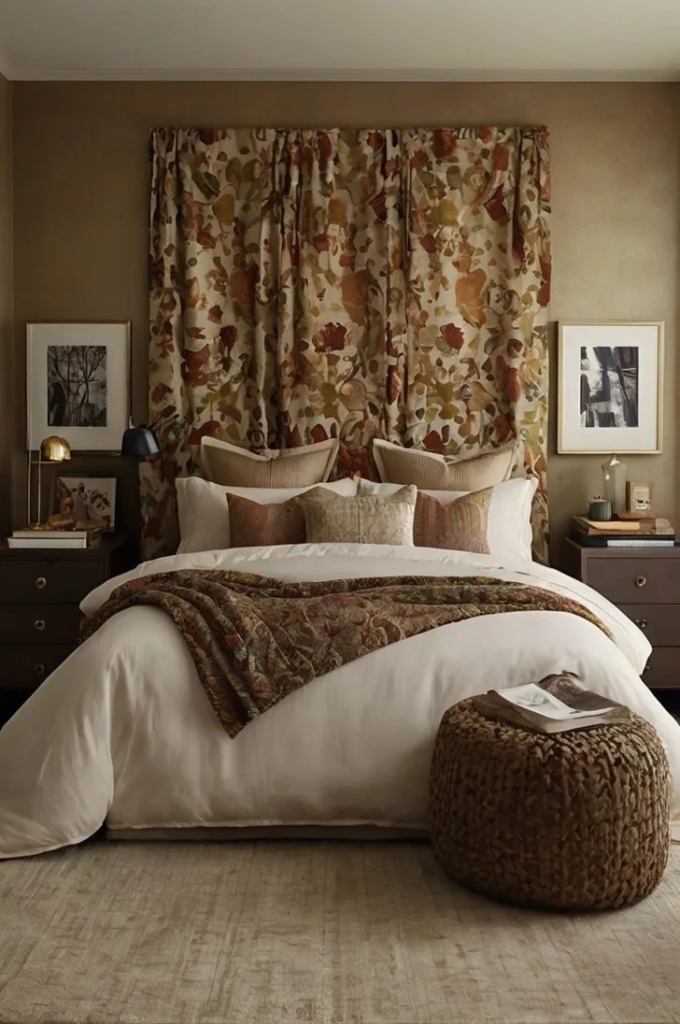 Fabric panels soften the wall and add warmth. Layering materials creates a rich and inviting effect. Choosing complementary colors ensures the decor blends with the bedding.