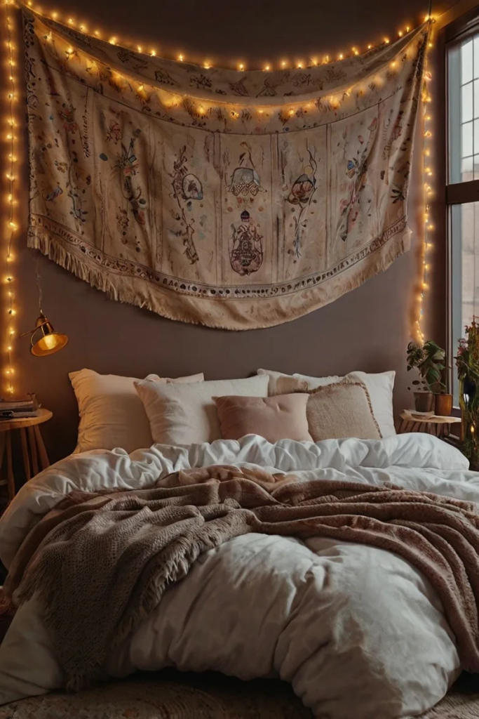 A tapestry acts as a bold focal point above the bed. Adding soft lighting enhances its presence. Together, they create a warm and inviting visual effect.