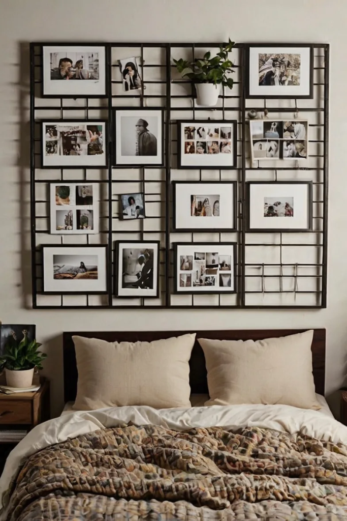 A grid allows for flexible and changeable decor. Photos and small items can be rearranged easily. This makes the wall feel interactive and personal.