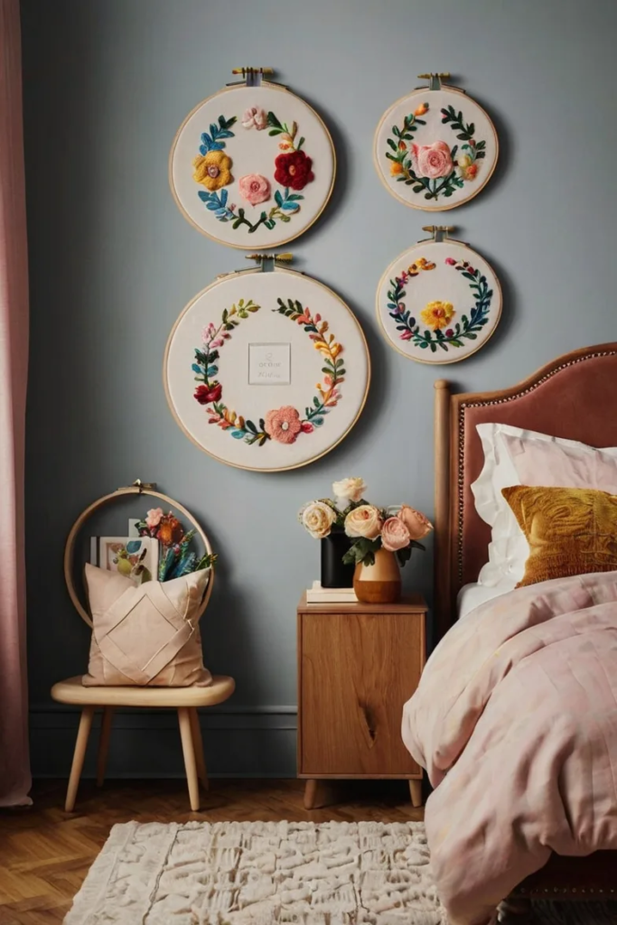 Embroidered hoops bring handcrafted charm to the bedroom. Their textures add softness to the wall. Mixing designs makes the display playful and creative.
