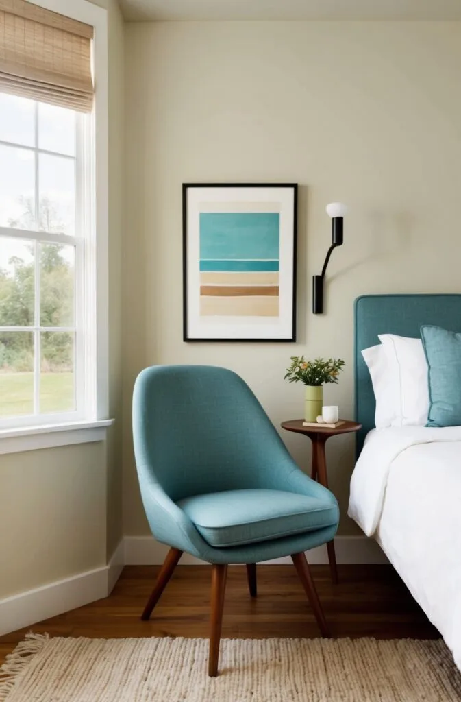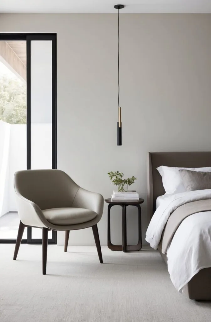 A minimalist accent chair is ideal when you want seating without visual clutter. Its clean shape and neutral palette keep the bedroom feeling open and calm. This type of chair works especially well in modern bedrooms or smaller spaces where every piece needs to earn its place. It blends effortlessly into the room while still serving a practical purpose.
