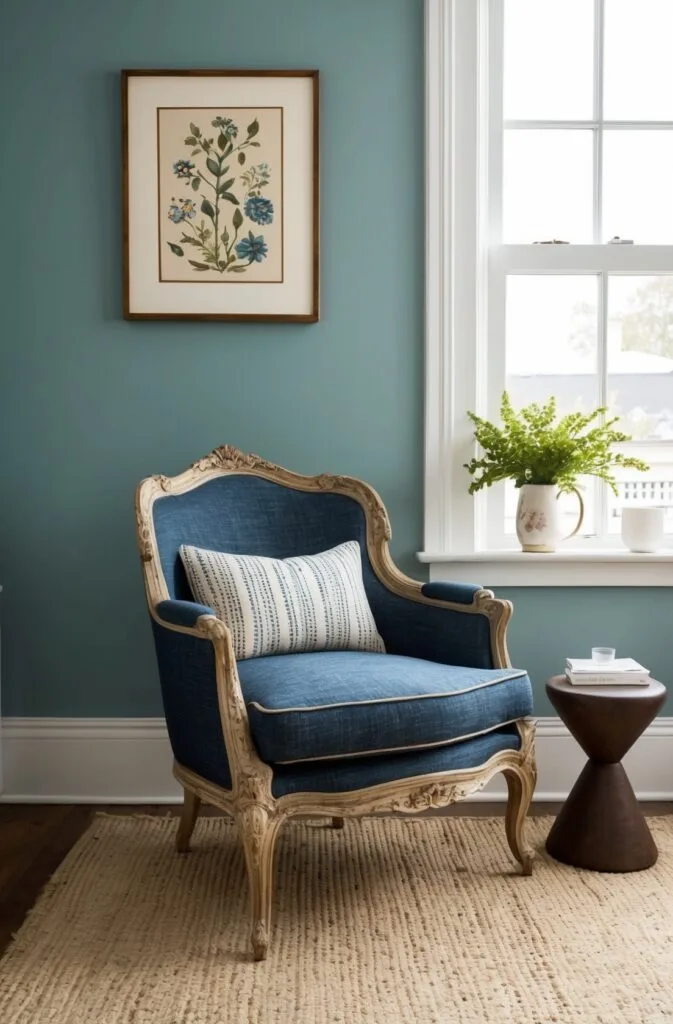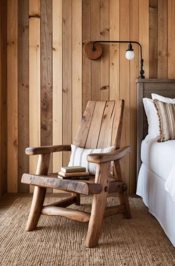 A rustic wooden chair introduces warmth through natural materials. Visible grain and texture help ground the space and make it feel cozy. This style works especially well with neutral colors and soft textiles.
