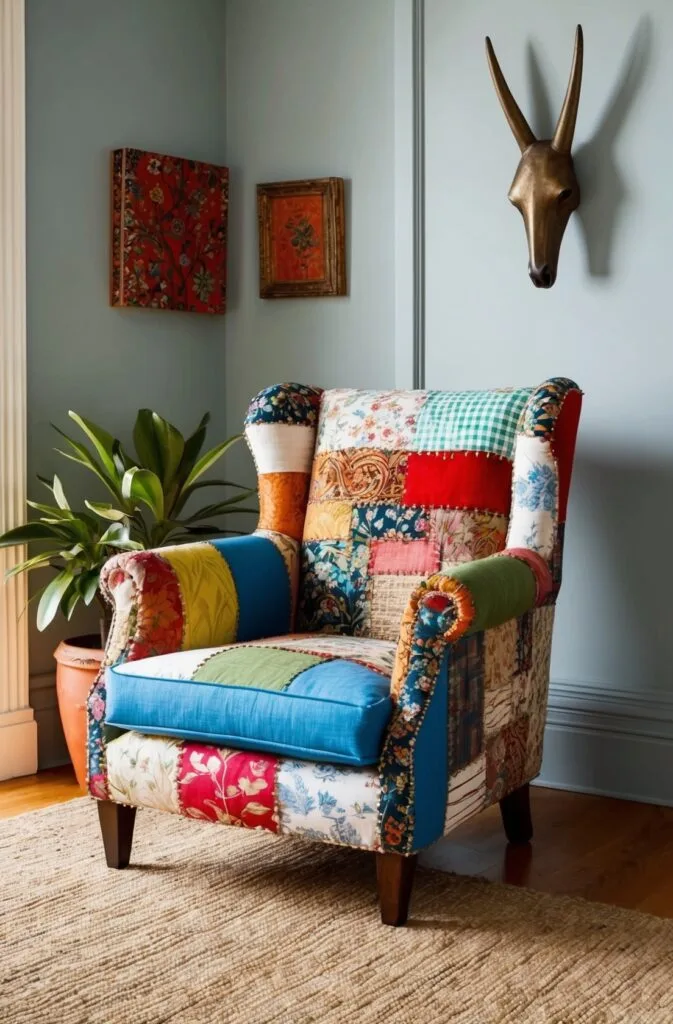 A patchwork upholstered chair brings color and creativity into the bedroom. It works well as a statement piece, especially when the rest of the room stays neutral. This chair reflects personality and adds energy without needing extra decor.