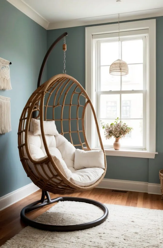 A hanging egg chair creates a cozy, enclosed seating area within the bedroom. It transforms unused corners into personal retreats and adds a unique visual element. Many people enjoy how it feels slightly separate from the rest of the room, making it perfect for quiet moments.