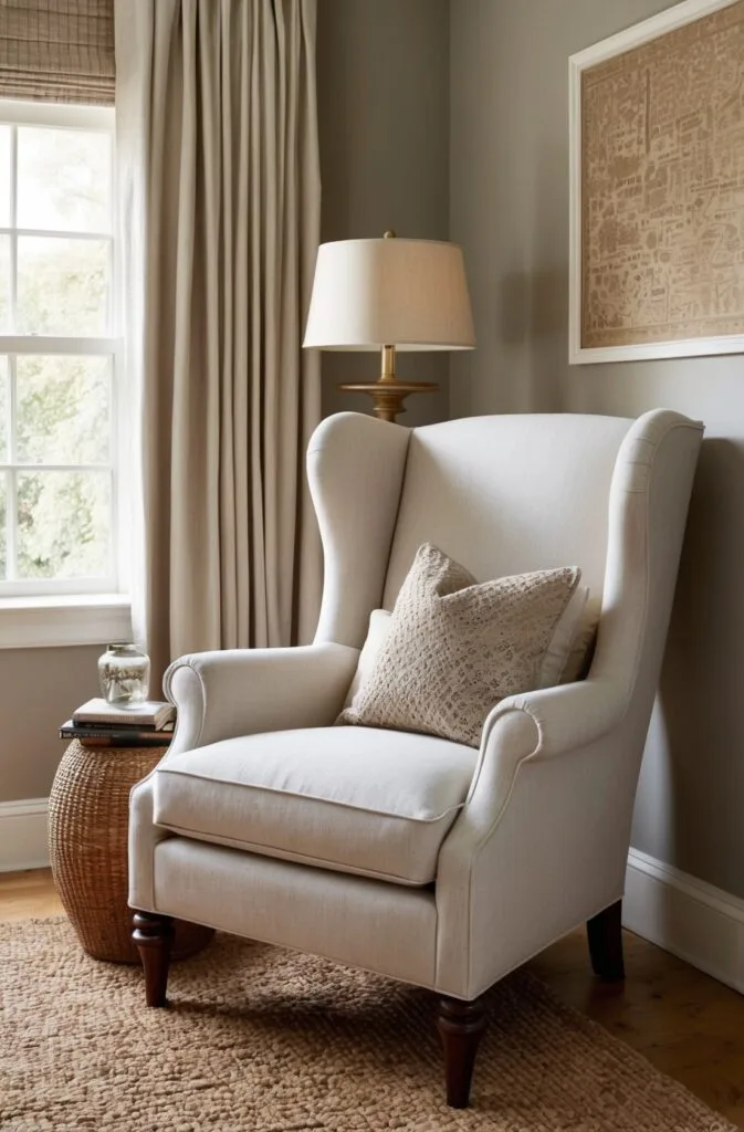 Wingback chairs bring classic elegance to the bedroom. Their high sides provide support while also framing the seating area nicely. With soft pillows or throws, they feel comfortable rather than formal.