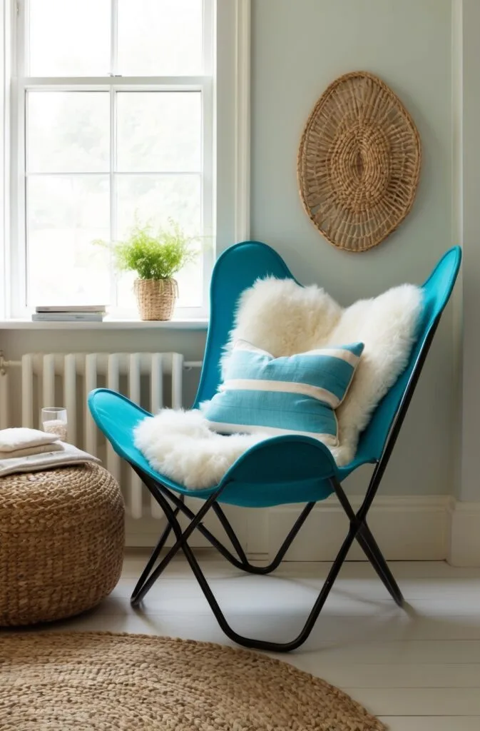 A butterfly chair offers a laid-back, lightweight seating option. Its open frame keeps the bedroom feeling airy, while added padding improves comfort. This chair works well in relaxed and youthful spaces.