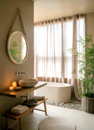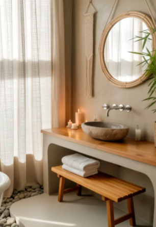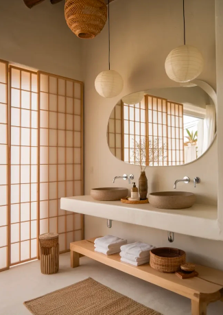 Japandi-boho bathrooms combine the minimal elegance of Japanese design with the cozy textures of boho style. Soft neutral tones, simple lines, and natural materials like bamboo or brushed wood create a calm and harmonious environment.