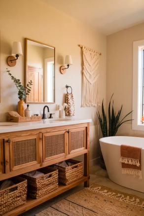 Rustic boho bathrooms create a welcoming and lived-in atmosphere through natural textures and materials. A wooden vanity, woven baskets, and textured towels contribute to the warm, cozy feel. Rounded mirrors, dimmable wall lighting, and simple shelving can complete the rustic charm. These small details help transform your bathroom into a space that feels both functional and inviting.