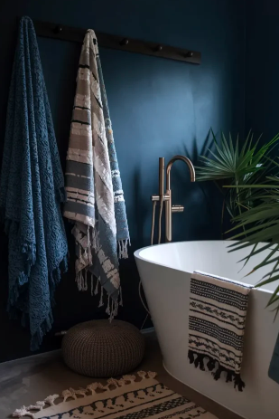 For a more dramatic look, moody boho bathrooms use rich, dark colors like deep navy or charcoal paired with gold or brass accents. Patterned tiles, textured towels, and statement fixtures make the space feel both sophisticated and cozy.