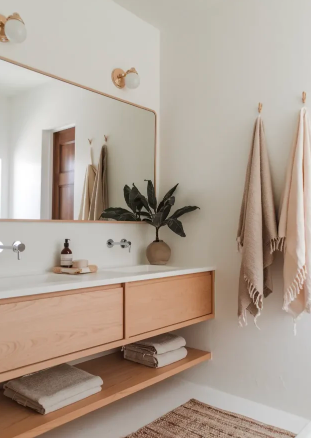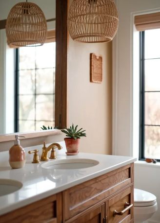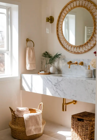 Scandi-boho style blends the simplicity of Scandinavian design with the layered warmth of boho aesthetics. Light wood vanities, clean white walls, and minimal décor create a calm and airy environment. Small touches like woven baskets or soft textiles maintain boho charm without overwhelming the space.