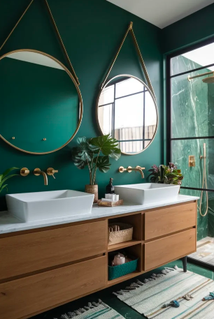 Emerald green is a striking choice that adds depth and sophistication to boho bathrooms. Use it on walls, cabinetry, or tiles, and complement it with wooden or brass elements to maintain a grounded aesthetic. These accents provide a polished yet natural look that can transform your bathroom into a stylish and fresh space.