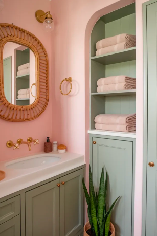 Blush pink and sage green can add playful energy to a boho bathroom. Incorporating these shades through walls, cabinetry, or accessories introduces vibrancy without overwhelming the room. This combination can help transform your bathroom into a cheerful and refreshing space.