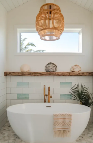 Boho coastal bathrooms mix natural textures with beach-inspired tones. Light wood, sandy shades, driftwood accents, and woven baskets create a breezy, relaxed environment. Incorporating these coastal elements can transform your bathroom into a serene seaside escape.