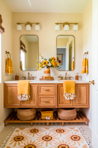 Yellow accents inject cheerfulness into boho bathrooms. Rugs, towels, or wall décor in warm golden shades complement earthy tones, giving the space a bright and inviting energy. Using yellow strategically can help transform your bathroom into a lively and welcoming space.