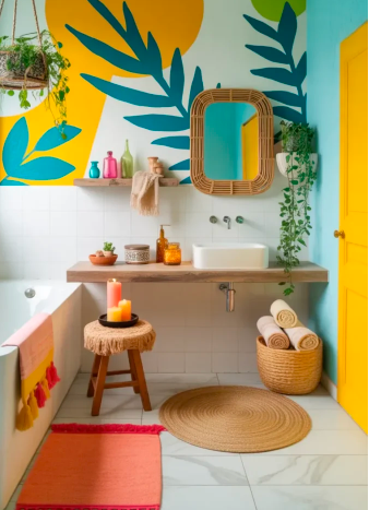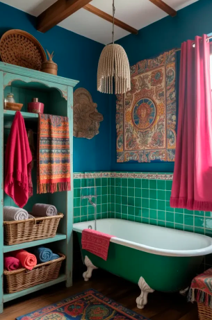 For those who love maximalism, mixing bold colors, playful patterns, and eclectic décor creates a vibrant boho space. Encaustic tiles, hand-painted ceramics, and jewel tones make the bathroom lively and unique. This approach can transform your bathroom into a colorful and energetic haven.