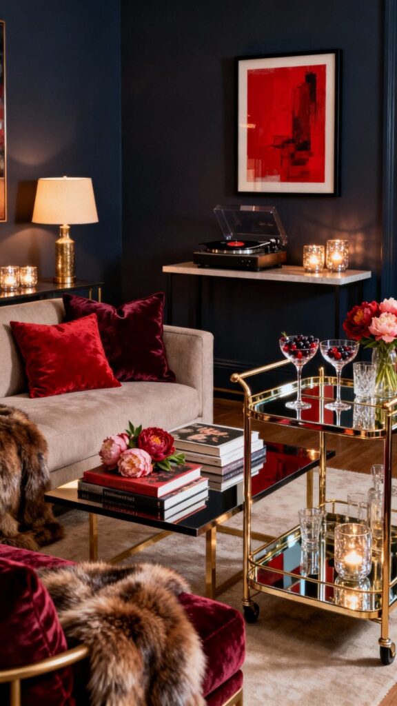A lounge-inspired baby shower leans into rich textures, deep colors, and low lighting for a dramatic but cozy feel. Plush pillows, soft throws, and warm ambient light make the room inviting, while a drink station and background music encourage guests to linger. This setup feels mature and stylish, offering a glamorous alternative to traditional Valentine décor.