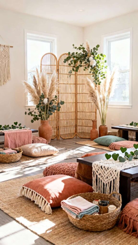 A boho-inspired setup uses natural textures, neutral tones, and greenery to create a relaxed yet elegant environment. Layered textiles, woven accents, and organic shapes bring warmth and movement into the space. This Valentine’s baby shower style feels easygoing, customizable, and visually inviting without being overly formal.
