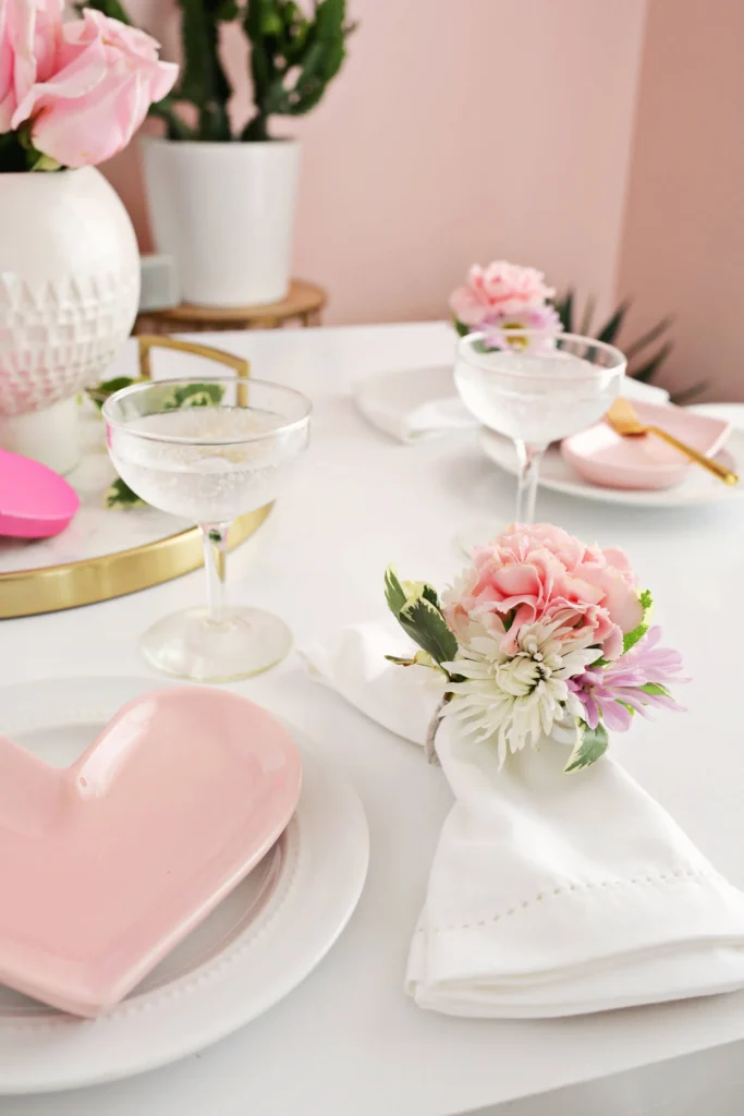 Bouquet-style napkin rings bring the entire table together with a small but noticeable detail. Whether using fresh or faux flowers, they add softness and color to the place settings. This simple touch enhances Valentines Day Table Decorations without requiring much time or cost.